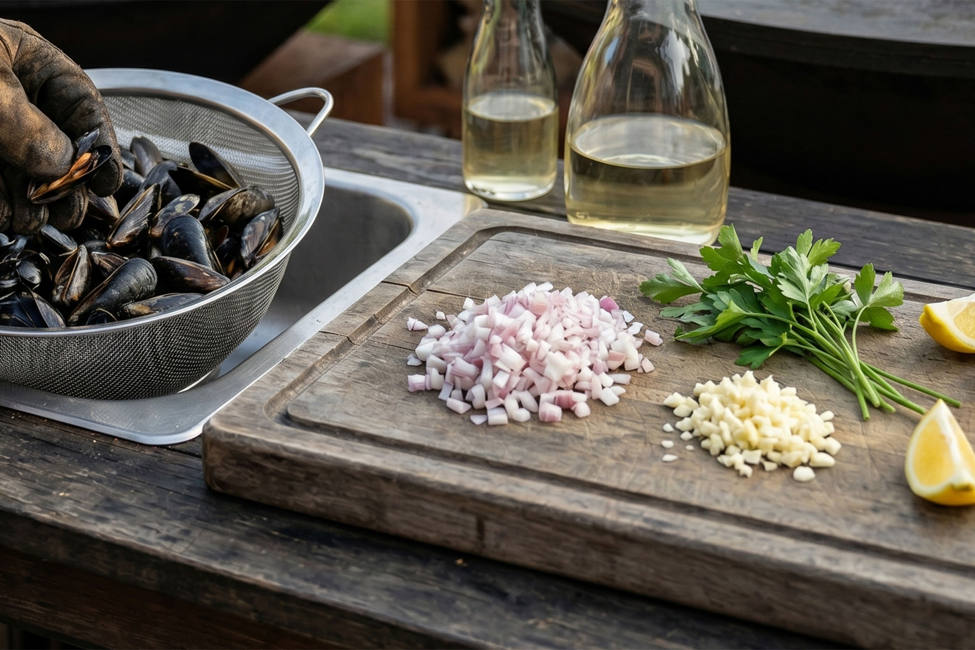 Heat oil on the griddle. Sauté the onion and garlic briefly, add the mussels, and deglaze with wine.