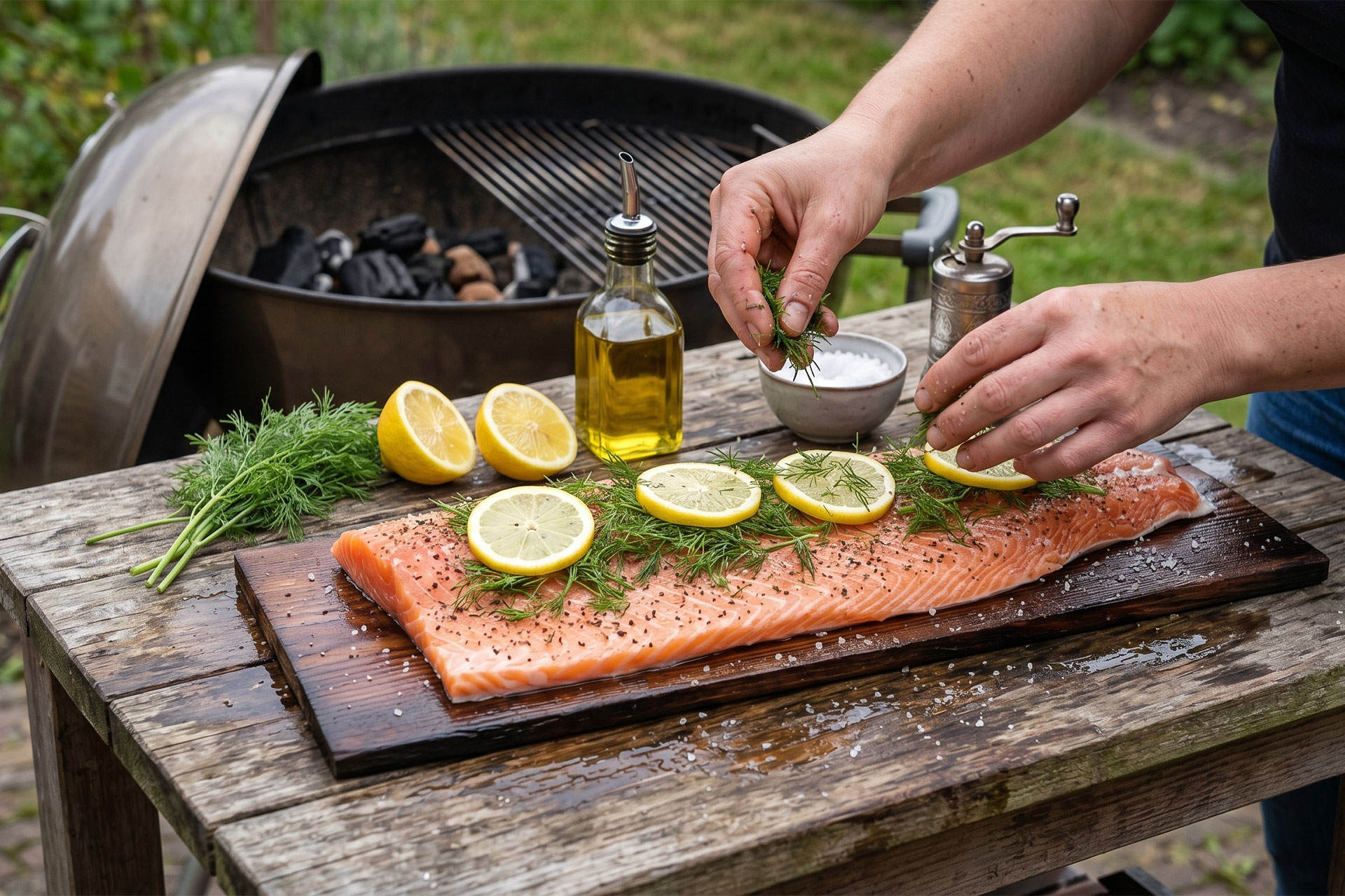 Smoky salmon with lemon and dill; elegantly prepared over an open flame.