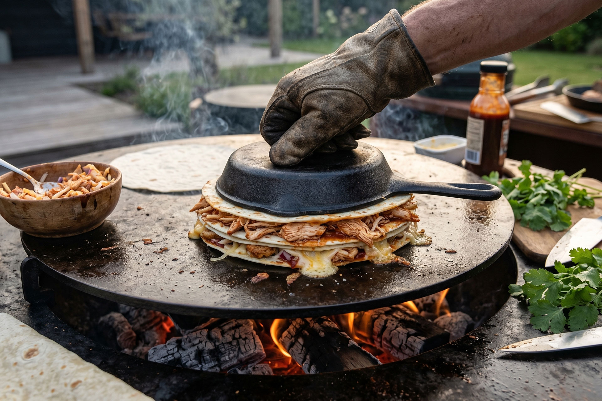 Divide the filling between 2 tortillas, then place a second tortilla on top. Grill for 2–3 minutes per side until golden brown.