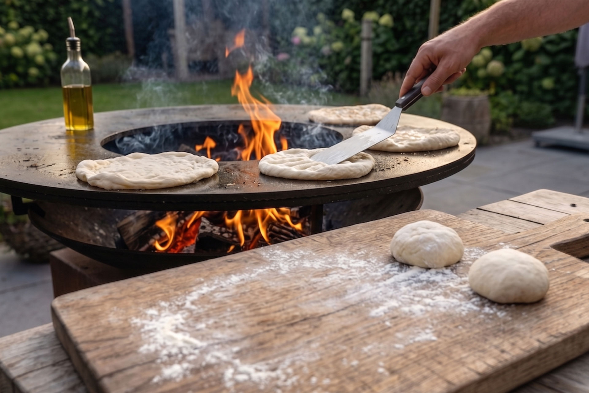 Zelf flatbread bakken op een stalen ring of vuurschaal is buitenkoken in zijn puurste vorm. Om dat deeg in een paar minuten luchtig te laten opbollen en een perfect goudbruin, knapperig korstje te geven, moet je bakplaat loeiheet zijn. Dat vraagt om een aanhoudende hittebron!